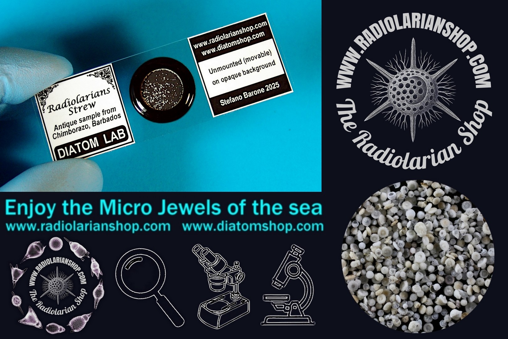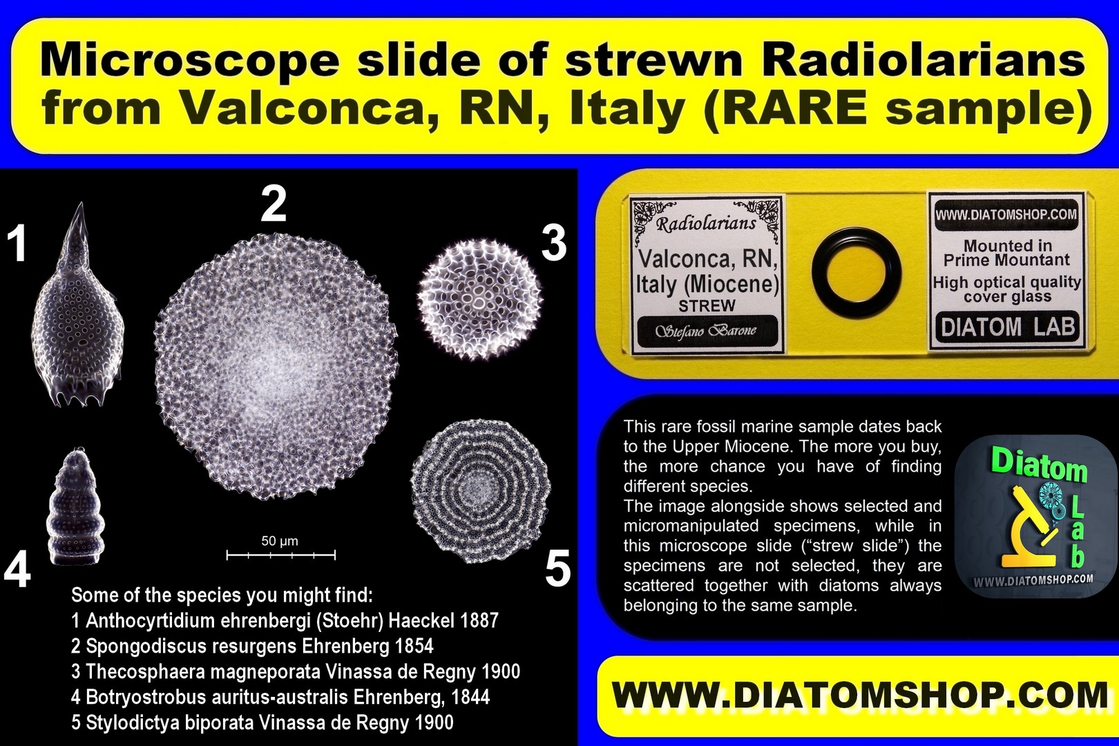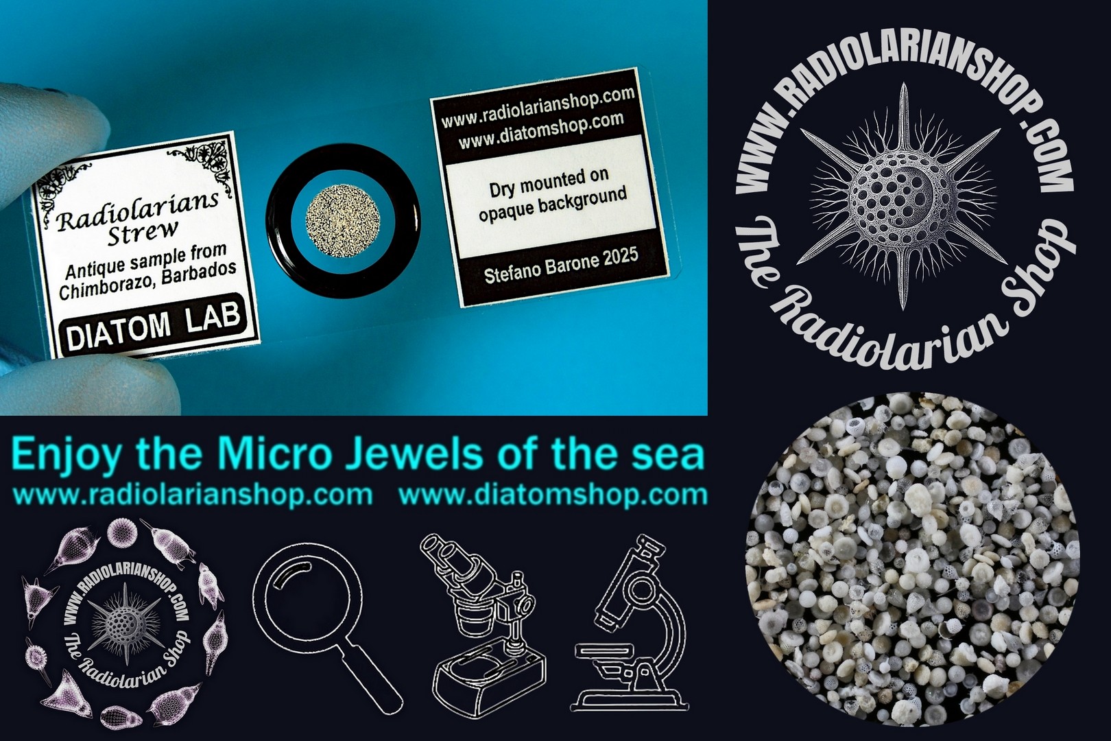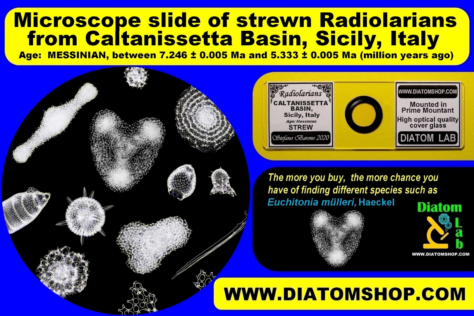 1) microscope slides of selected, micromanipulated Radiolarians (where art meets advanced technology and innovative materials); 2) strew Radiolarians slides = microscope slides of strewn, unselected Radiolarians. Strew slides reveal the complex beauty of a natural sample at a glance. Along with several beautiful and intact specimens, you may also find broken or otherwise imperfect specimens: this happens not because our laboratory procedures, but because the majority of samples found in nature have these characteristics. Our stew slides are of the highest quality and are made with innovative materials, as can be seen from our more than a thousand 100% positive feedbacks. If you wish to purchase preparations containing 100% perfect specimens, please buy our microscope slides of selected, micromanipulated Radiolarians, which you can also find in this price list.