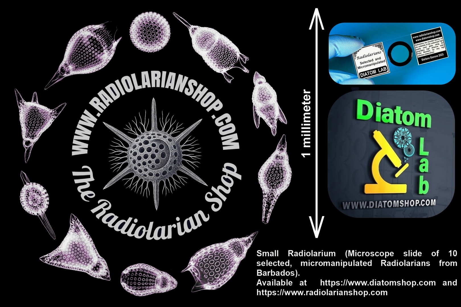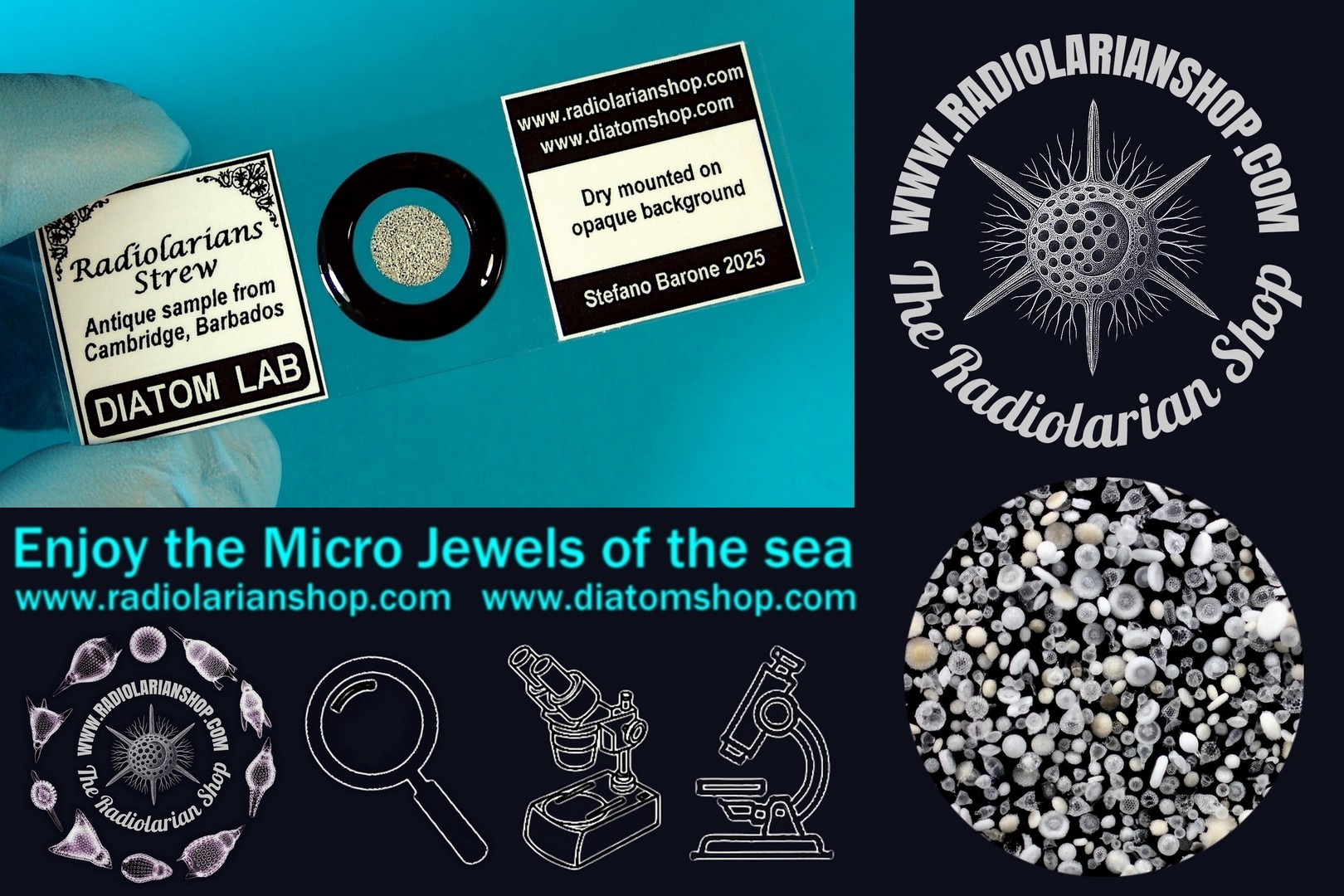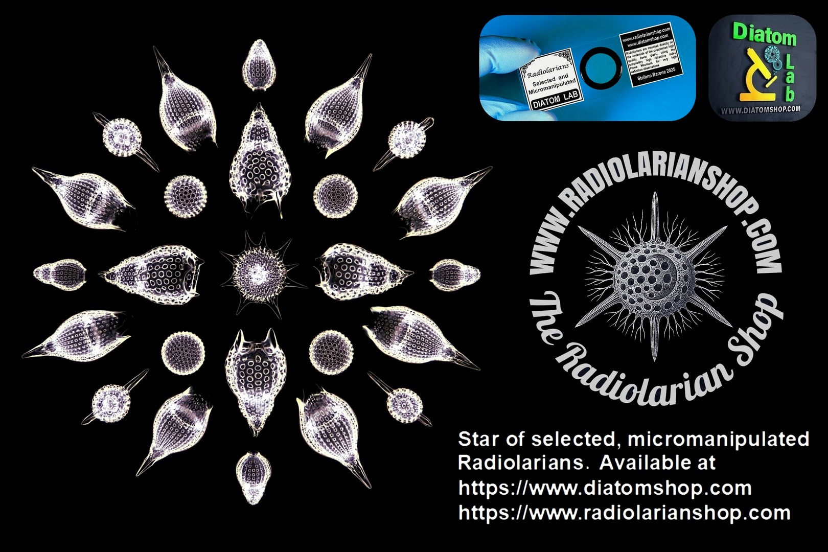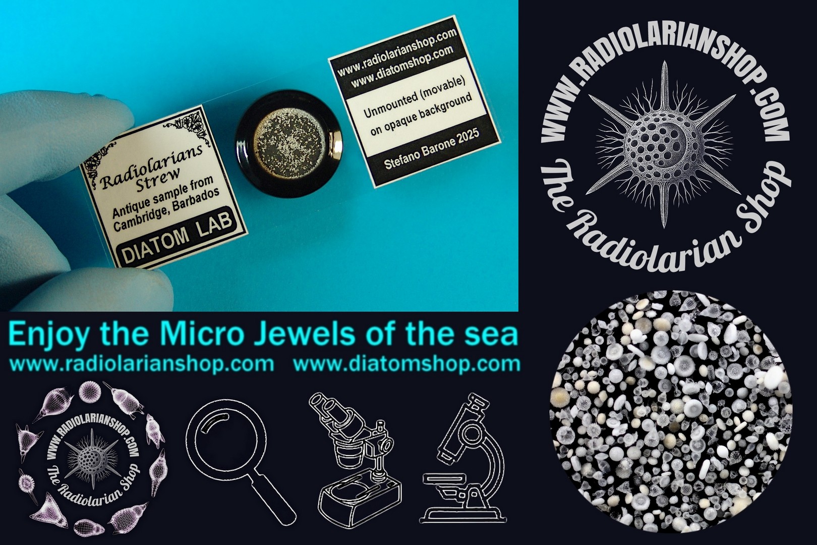 1) microscope slides of selected, micromanipulated Radiolarians (where art meets advanced technology and innovative materials); 2) strew Radiolarians slides = microscope slides of strewn, unselected Radiolarians. Strew slides reveal the complex beauty of a natural sample at a glance. Along with several beautiful and intact specimens, you may also find broken or otherwise imperfect specimens: this happens not because our laboratory procedures, but because the majority of samples found in nature have these characteristics. Our stew slides are of the highest quality and are made with innovative materials, as can be seen from our more than a thousand 100% positive feedbacks. If you wish to purchase preparations containing 100% perfect specimens, please buy our microscope slides of selected, micromanipulated Radiolarians, which you can also find in this price list.