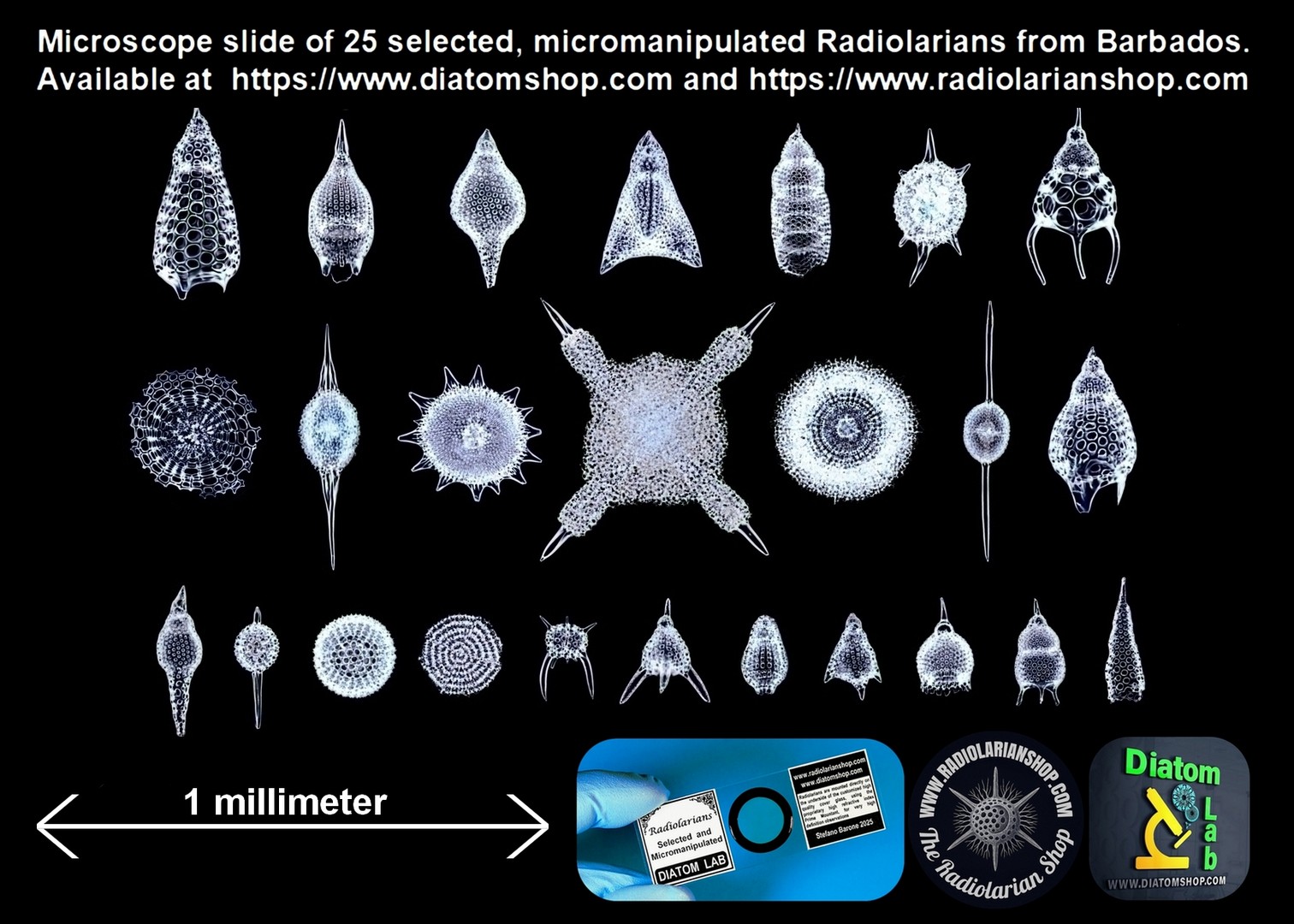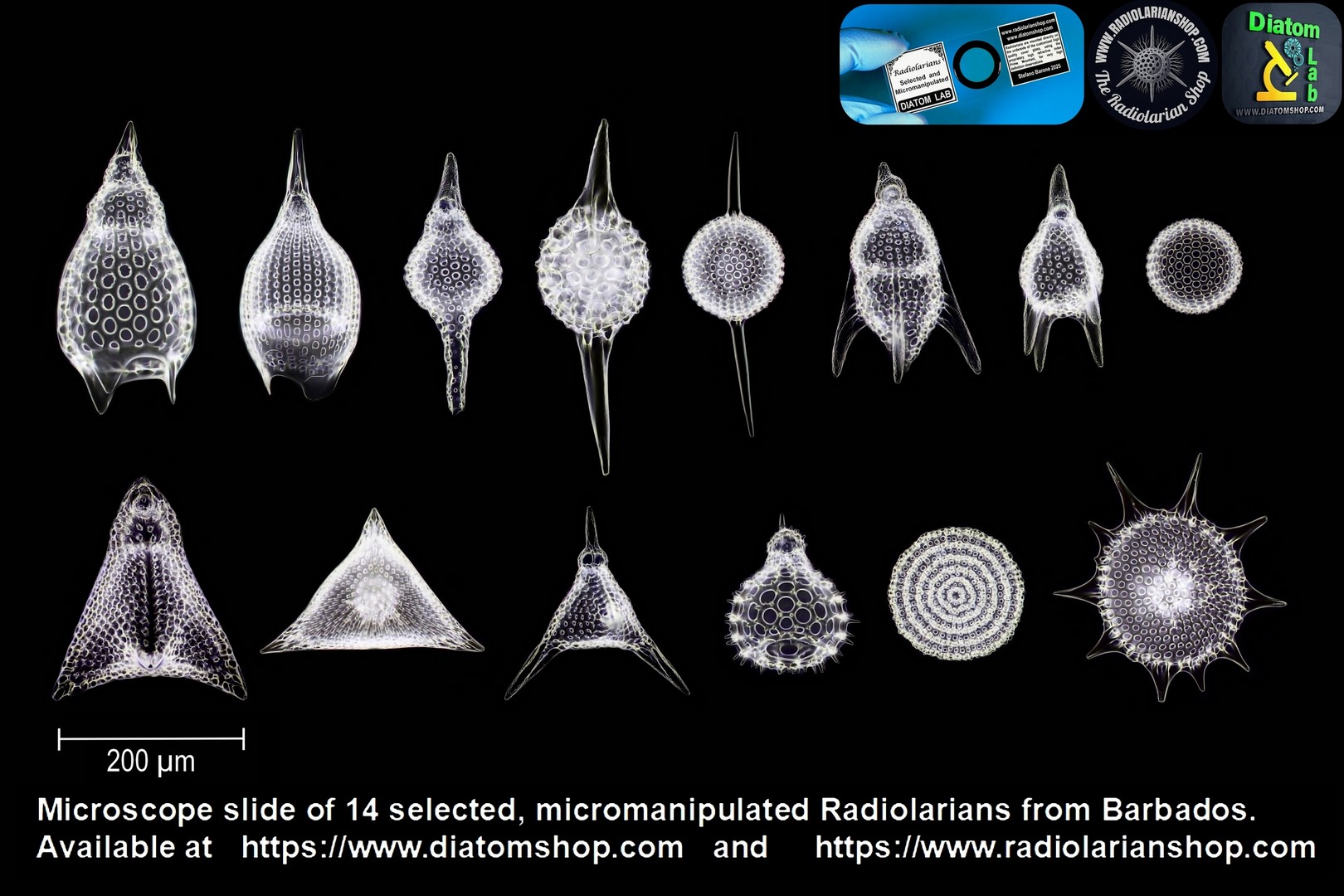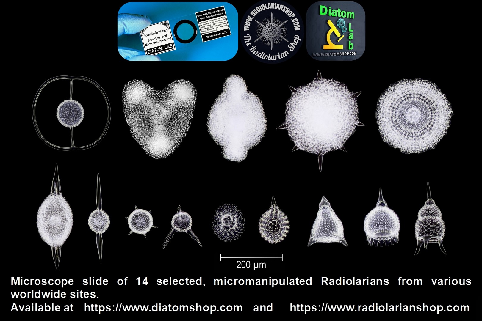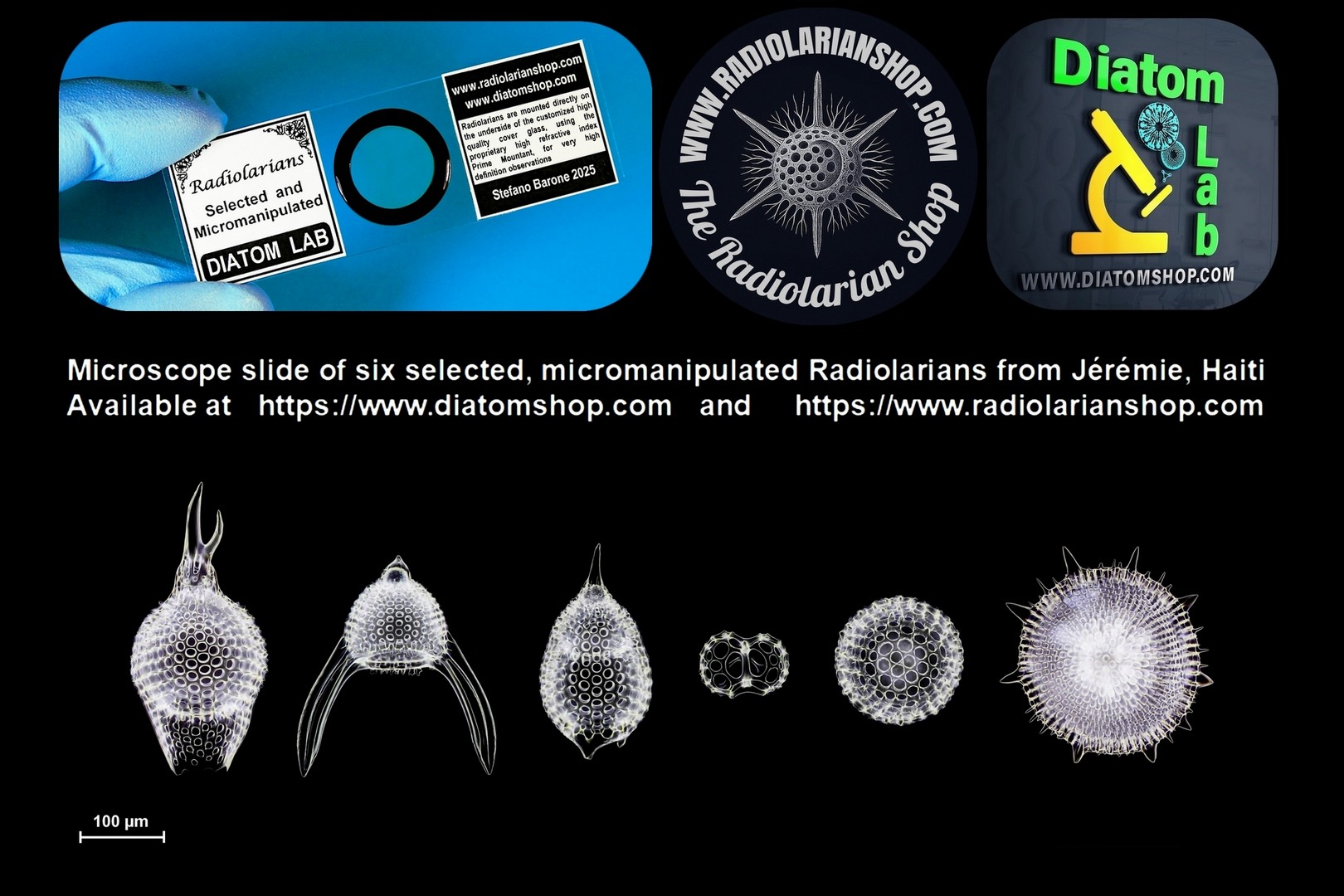 1) microscope slides of selected, micromanipulated Radiolarians (where art meets advanced technology and innovative materials); 2) strew Radiolarians slides = microscope slides of strewn, unselected Radiolarians. Strew slides reveal the complex beauty of a natural sample at a glance. Along with several beautiful and intact specimens, you may also find broken or otherwise imperfect specimens: this happens not because our laboratory procedures, but because the majority of samples found in nature have these characteristics. Our stew slides are of the highest quality and are made with innovative materials, as can be seen from our more than a thousand 100% positive feedbacks. If you wish to purchase preparations containing 100% perfect specimens, please buy our microscope slides of selected, micromanipulated Radiolarians, which you can also find in this price list.