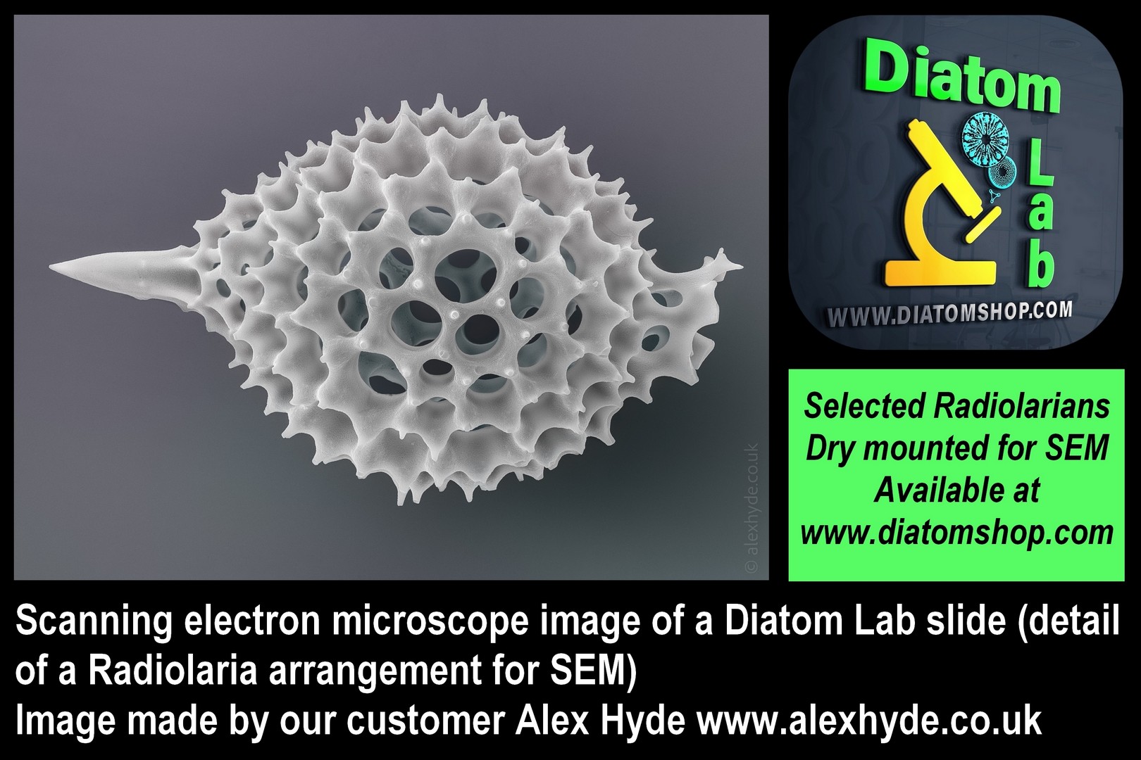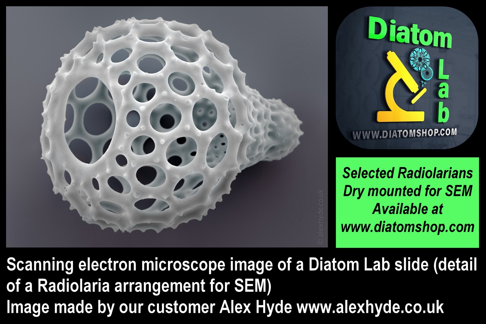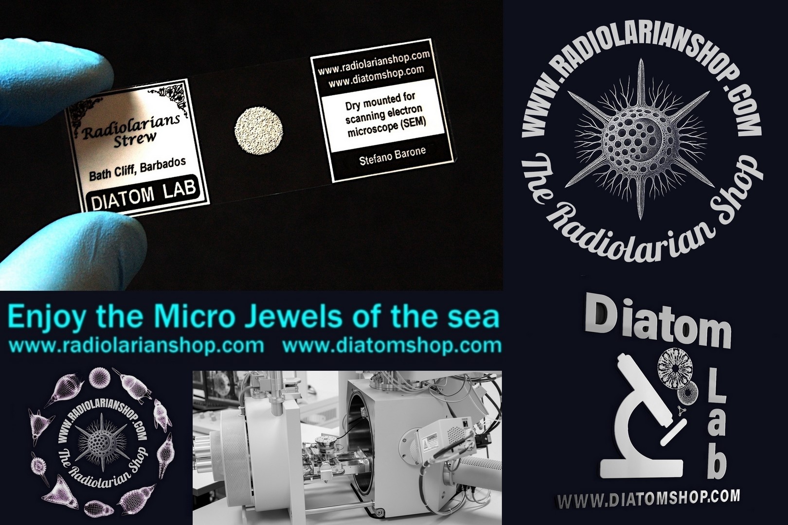 Let's start your collection of beautiful, rare specimens from many parts of the world! You don't need a microscope to observe them, in fact - in case you buy the ones dry mounted on a opaque background - they can also be admired through a powerful magnifying glass (from 15x magnification and up)! We sell a large variety of professionally prepared Radiolarians to be observed through magnifying glass, stereo microscope, light microscope and scanning electron microscope (SEM): check out our catalog below! Diatom Lab offers meaningful products that exude science, art and culture: we are against superficiality and superficial objects.