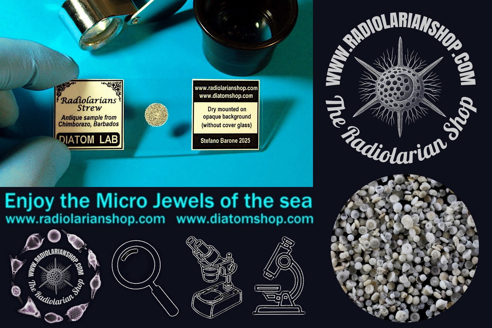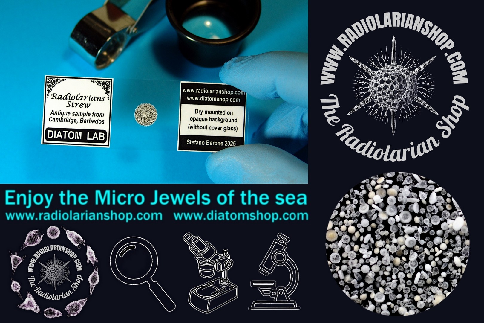 touch the Radiolarians to avoid them breaking. To create these products, we selected two extremely rare and antique samples that contain some of the largest specimens in the world, which are therefore more easily observable: they come from two locations frequently cited in the Nineteenth century scientific literature.Each microscope slide contains strewn Radiolarians in abundance. Since in this case Radiolarians are not protected by cover glass: a) do not touch the center of the microscope slide to avoid damaging them; b) to prevent dust from settling, after observations store the slide in the mailer case that will be sent to you.