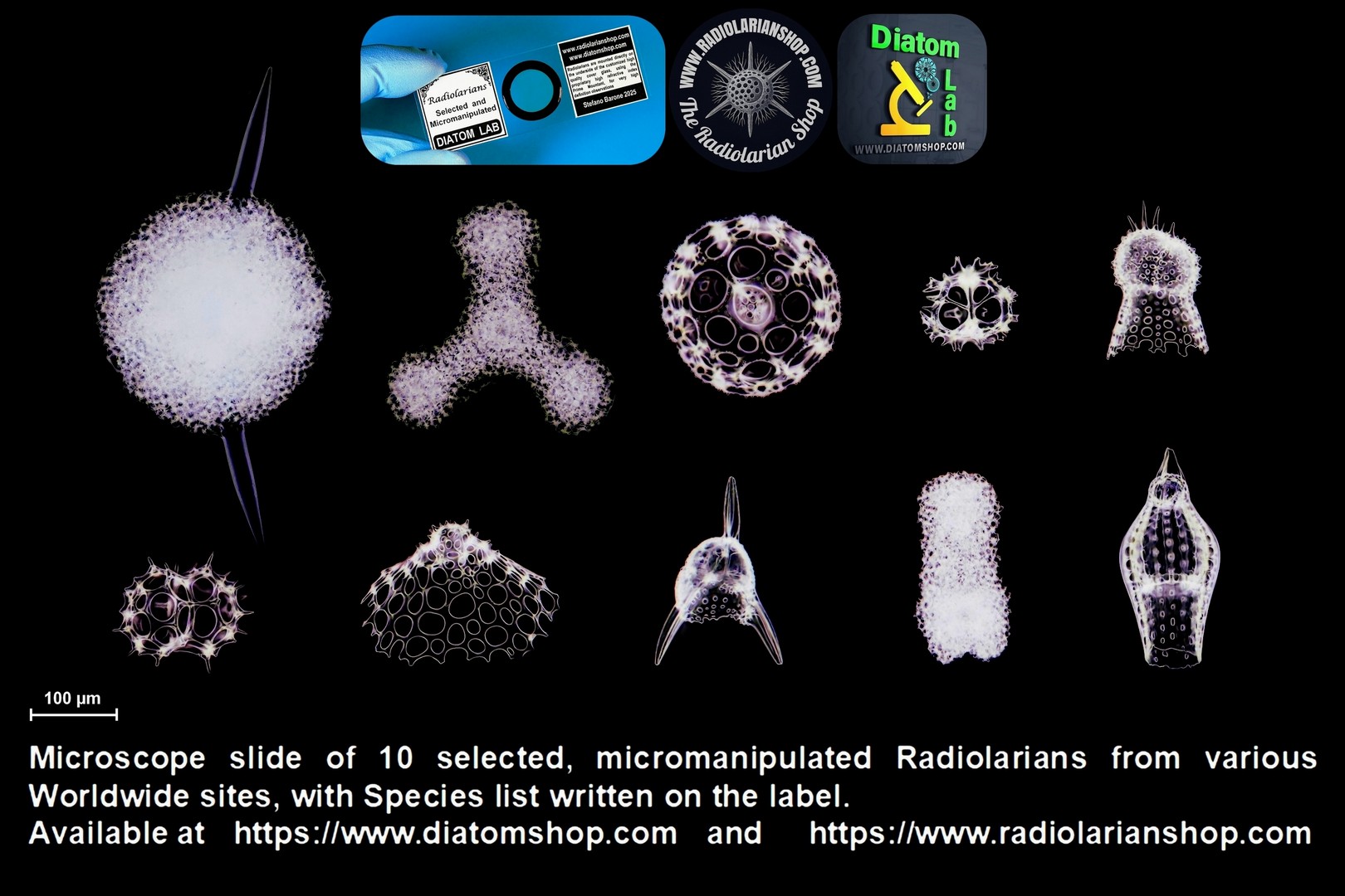 Microscope slide of 10 selected, micromanipulated Radiolarians from various Worldwide sites, WITH SPECIES LIST PRINTED ON THE LABEL. Without duplicates, arranged in parallel lines or in circle and mounted in Prime Mountant, excellent high refractive index mountant with refractive index > 1,7. See example in dark field illumination on the side