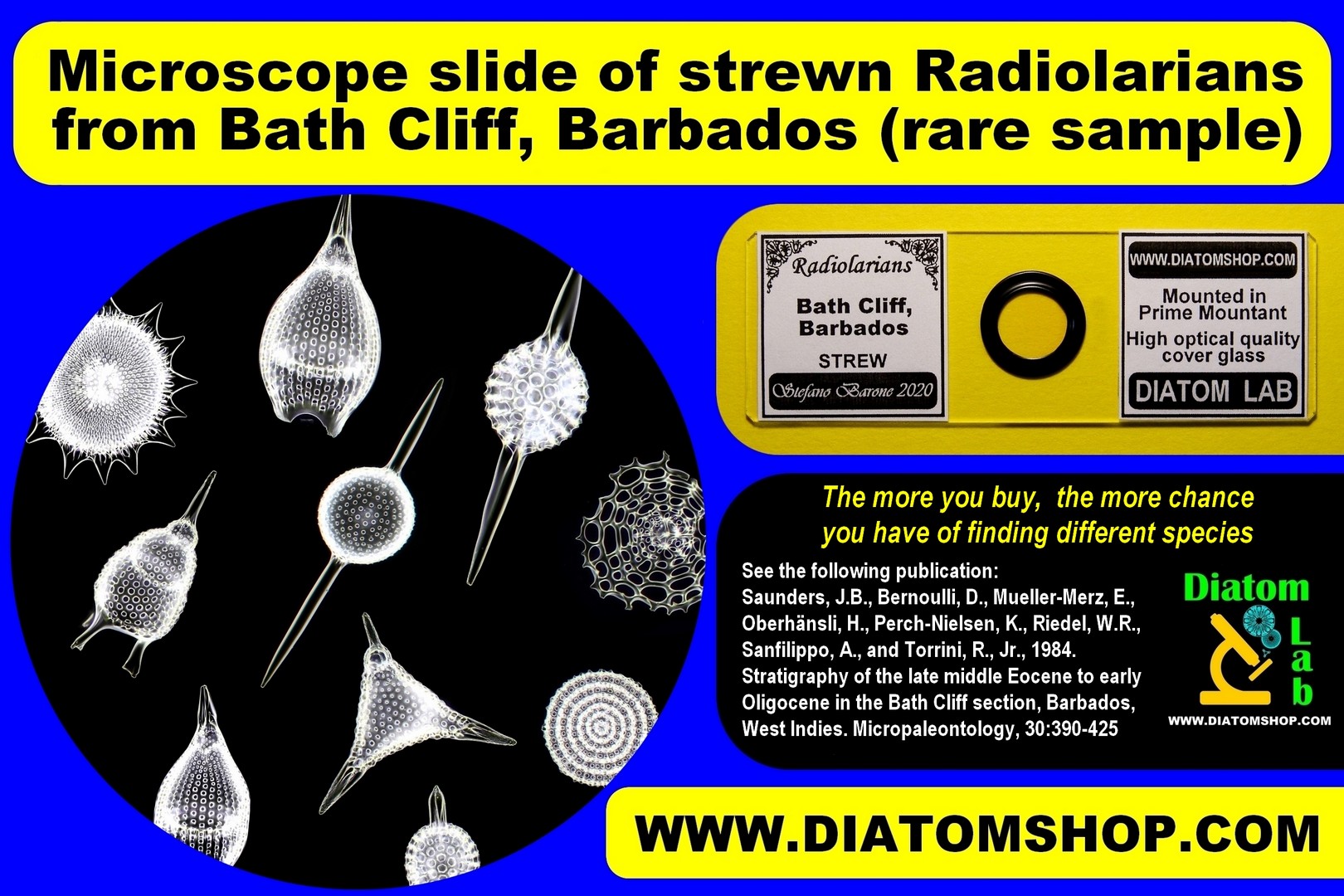 The more you buy, the more chance you have of finding different species!Microscope slide of strewn Radiolarians from Bath Cliff, RARE sample from Barbados, mounted in Prime Mountant, excellent high refractive index mountant with refractive index > 1,7. (Described in the publication: Saunders, J.B., Bernoulli, D., Mueller-Merz, E., Oberhänsli, H., Perch-Nielsen, K., Riedel, W.R., Sanfilippo, A., and Torrini, R., Jr., 1984. Stratigraphy of the late middle Eocene to early Oligocene in the Bath Cliff section, Barbados, West Indies. Micropaleontology, 30:390−425)