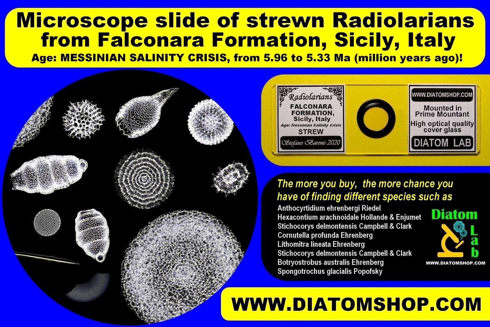EXTREMELY RARE Microscope slide of strewn Radiolarians from FALCONARA FORMATION. Age: MESSINIAN SALINITY CRISIS, from 5.96 to 5.33 Ma (million years ago)! Mounted in Prime Mountant, excellent high refractive index mountant with refractive index > 1,7. The more you buy, the more chance you have of finding different species!