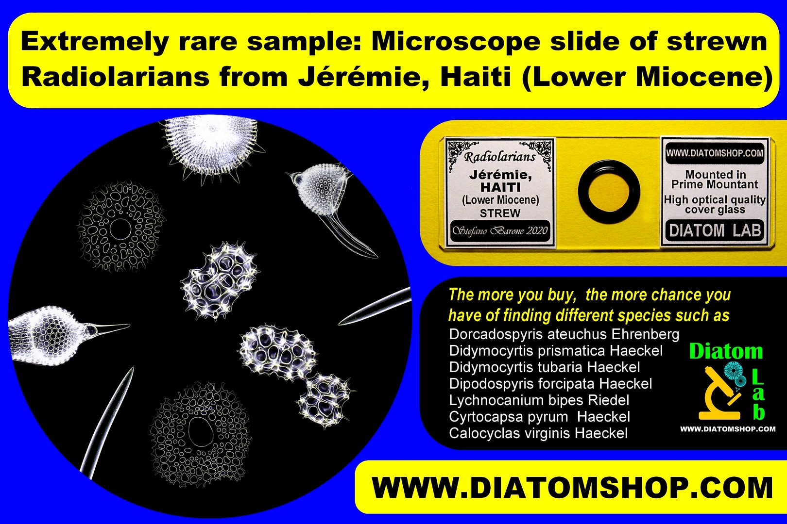 The more you buy, the more chance you have of finding different species! EXTREMELY RARE Microscope slide of strewn Radiolarians from Jérémie, HAITI (Lower Miocene). Mounted in Prime Mountant, excellent high refractive index mountant with refractive index > 1,7. For Diatom Lab it was very difficult to collect several samples in Haiti, because of the current unstable and dangerous security situation in that country, located on the island of Hispaniola!