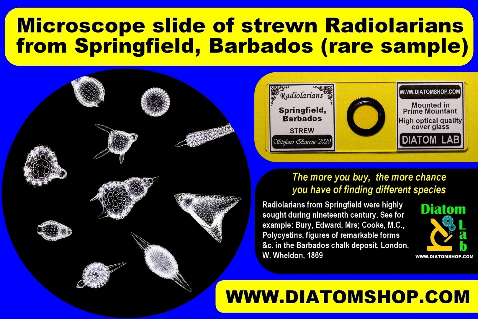 The more you buy, the more chance you have of finding different species!Microscope slide of strewn Radiolarians from Springfield, Barbados, rare sample, mounted in Prime Mountant, excellent high refractive index mountant with refractive index > 1,7. Radiolarians (Polycystine) from Springfield were highly sought during nineteenth century, see for example: 1) Bury, Edward, Mrs; Cooke, M.C., Polycystins, figures of remarkable forms &c. in the Barbados chalk deposit (chiefly collected by Dr. Davy, and noticed in a lecture delivered to the Agricultural Society of Barbados, in July, 1846), London, W. Wheldon, 1869; 2) Association for Advancement of Science, Report of the Seventeenth Meeting of the British Association for the Advancement of Science, held at Oxford in June 1847, London, John Murray, 1848